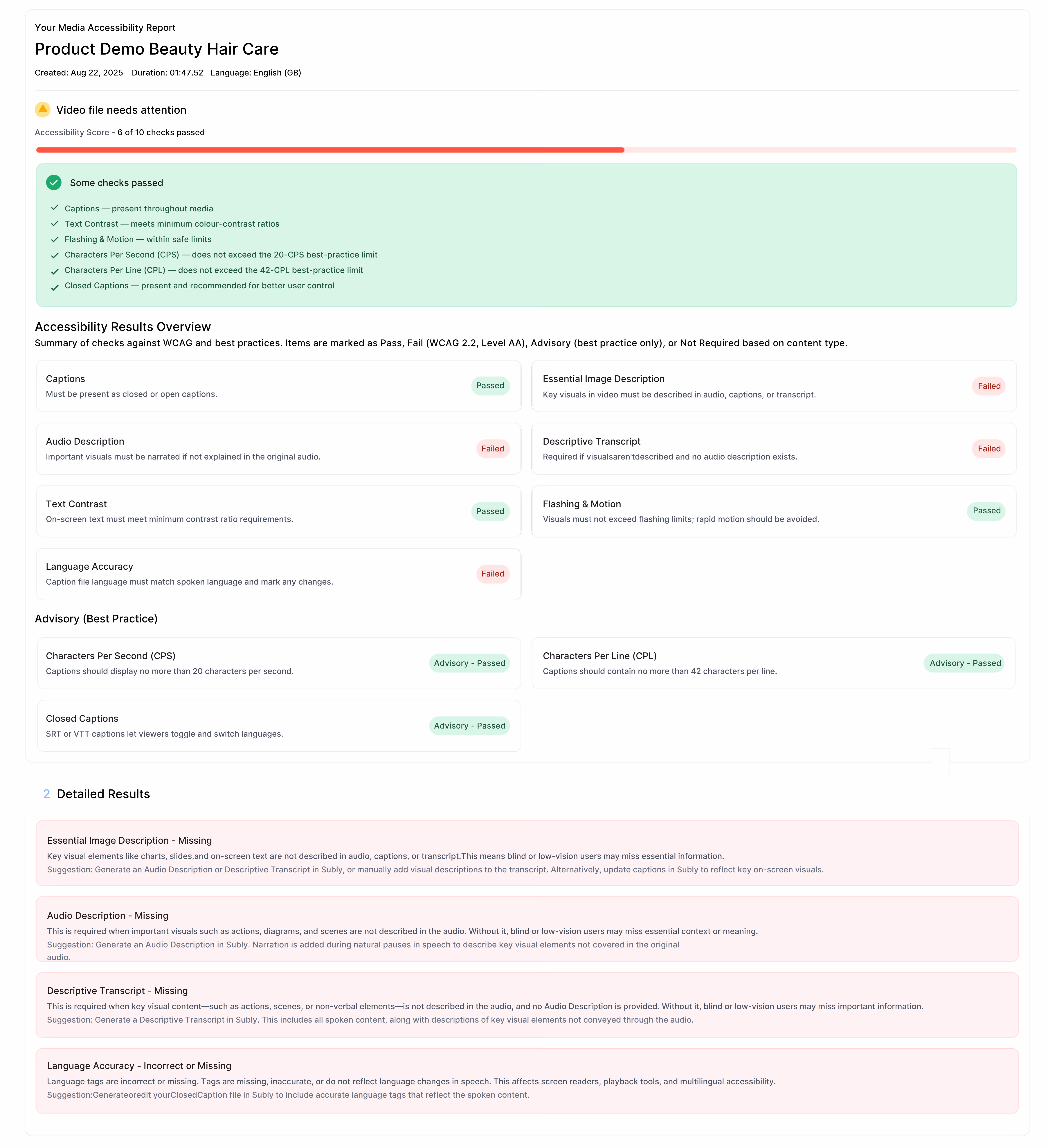 - Automatic WCAG 2.2 checks on product demos to verify captions are correct, confirm whether key images are described, determine if transcripts, descriptive transcripts, or audio description are needed, and flag flashing, colour contrast, and language tag issues. Industry best practice reviews are also provided alongside WCAG checks to give the team clarity on how to keep content fully accessible.