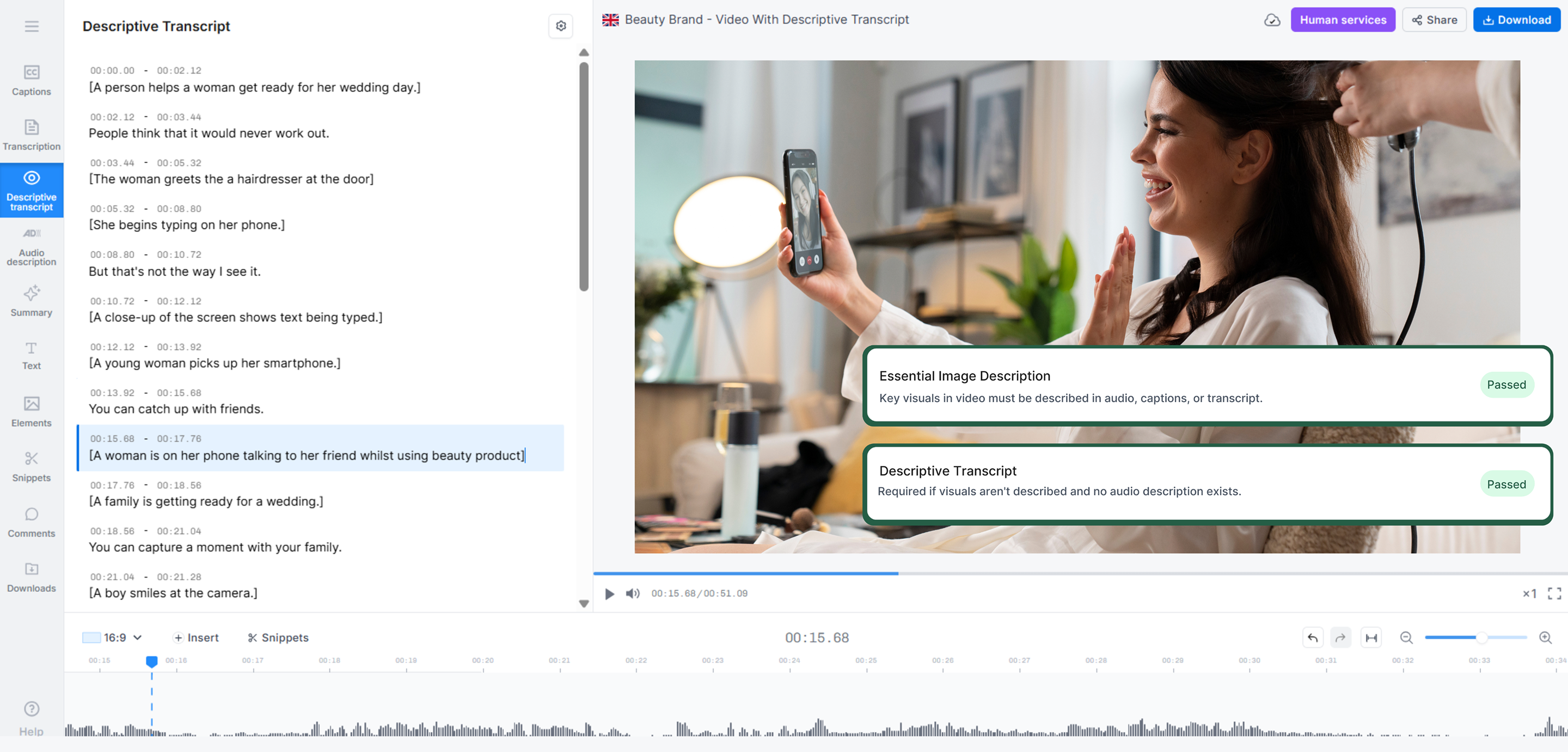 The brand’s content and ecommerce team creates and oversees these product demos. When a major marketplace introduced stricter accessibility requirements, including mandatory descriptive transcripts for all video assets, the team suddenly faced the risk of product listings being removed during the busiest trading season. To ensure legal compliance with accessibility regulations, they needed a solution that could both clarify the regulations and fix their content quickly.